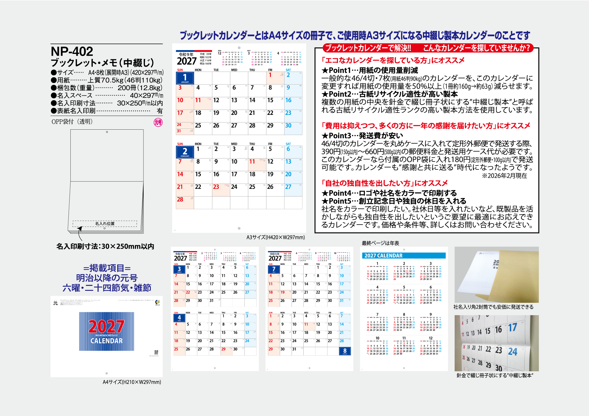 2027年|NP402ブックレット・メモカレンダー<中綴じ>